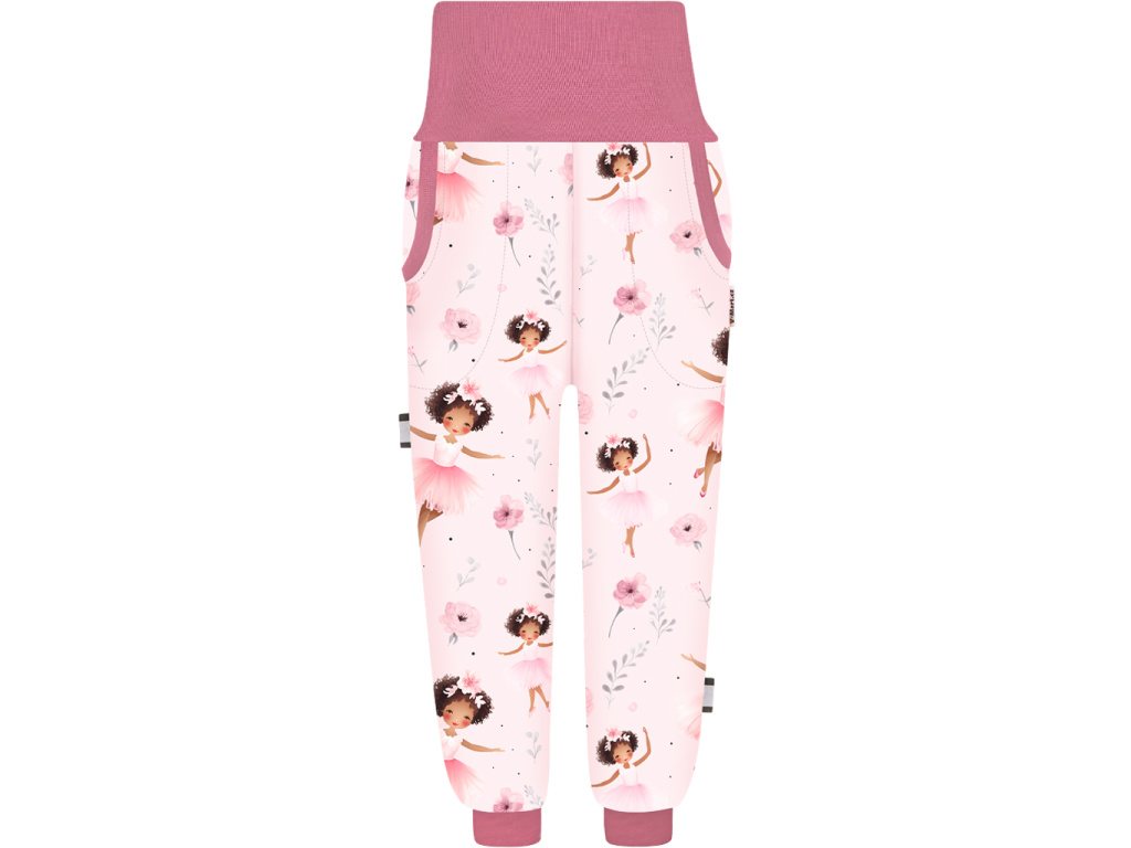 Dívčí letní softshellové kalhoty s potiskem baletek na světle růžovém podkladu. Náplety (lemování kapes, pas, ukončení nohavic) jsou ve starorůžové barvě.