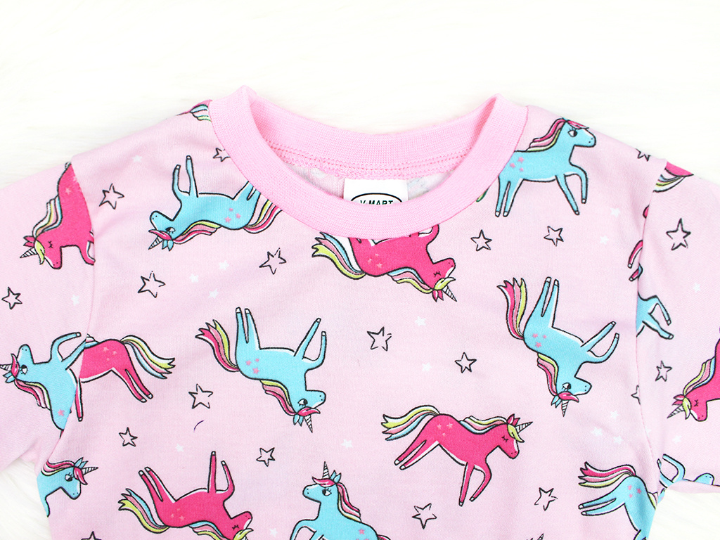 Bavlněné dívčí pyžamo s jednorožci na světle růžovém podkladu je doplněno světle růžovým nápletem (95% bavlna, 5% elastan) u krku a jako zakončení rukávů a nohavic. Pyžamko je ušito z příjemného 100% bavlněného oboulícního úpletu.