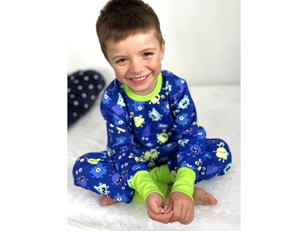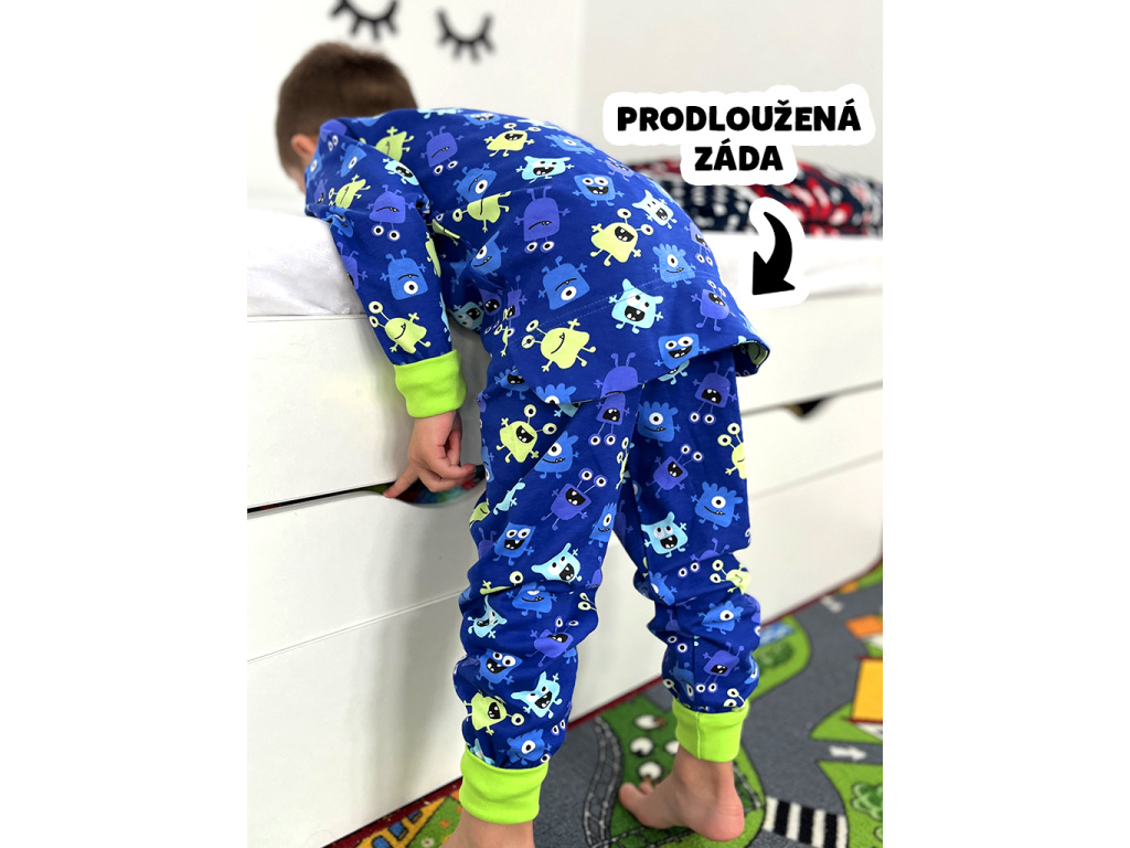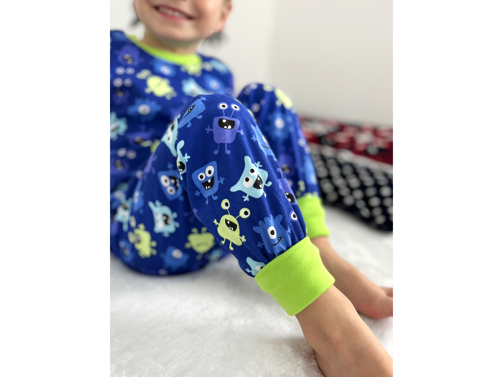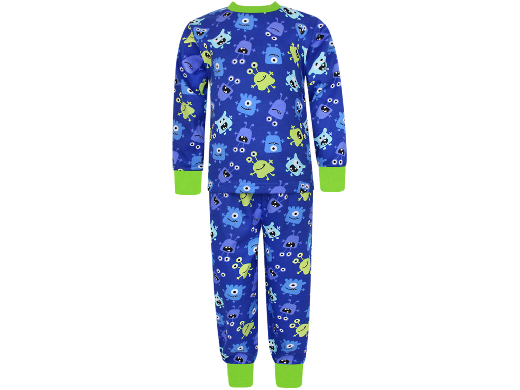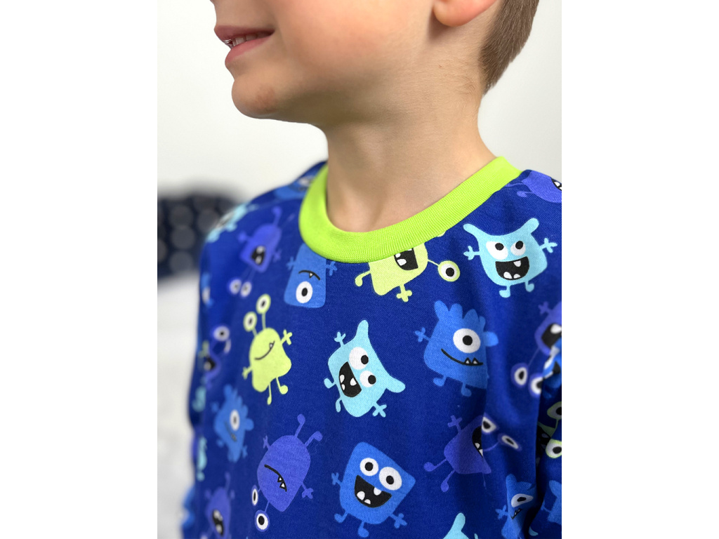Bavlněné chlapecké pyžamo se vzorem příšerek na tmavě modrém podkladu je doplněno svítivě zeleným nápletem (95% bavlna, 5% elastan) u krku a jako zakončení rukávů a nohavic. Pyžamko je ušito z příjemného 100% bavlněného oboulícního úpletu.