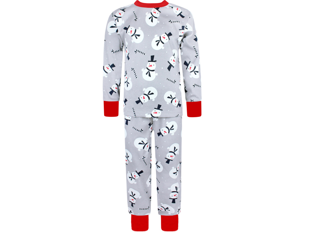 Bavlněné dětské vánoční pyžamo se vzorem sněhuláků na světle šedém podkladu je doplněno červeným nápletem (95% bavlna, 5% elastan) u krku a jako zakončení rukávů a nohavic. Pyžamko je ušito z příjemného 100% bavlněného oboulícního úpletu.