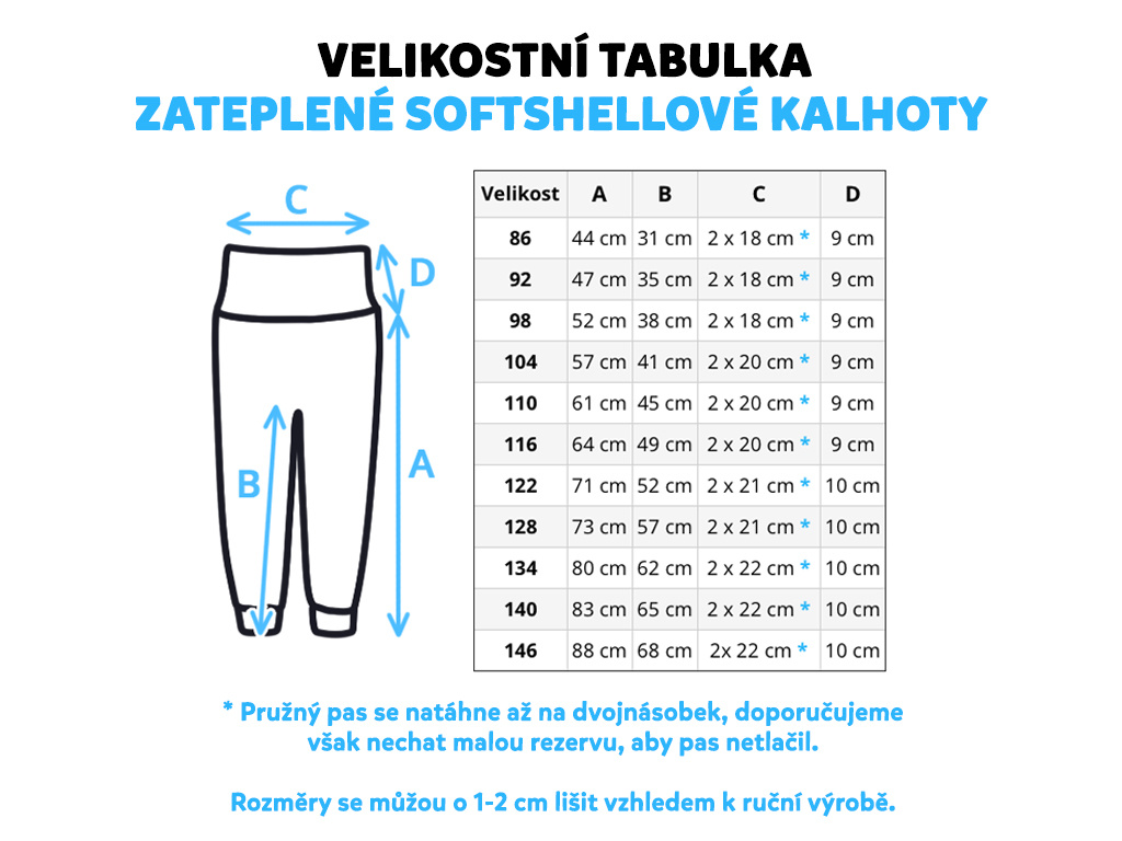 Naše švadlenky v pružném pase předšívají malou dírku na protažení gumy. Díky této vychytávce je možné zmenšit obvod pasu tak, aby sedl i těm nejhubenějším dětem. Je vhodné do kalhot provlékat širší gumy (2 cm a více), je to pro děti pohodlnější a guma se nebude v pase přetáčet. Gumu stříhejte vždy o malý kousek menší, než je obvod pasu dítěte, aby hezky držela.